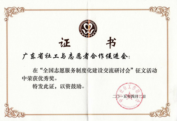 全国志愿服务制度化建设交流研讨会优秀奖证书