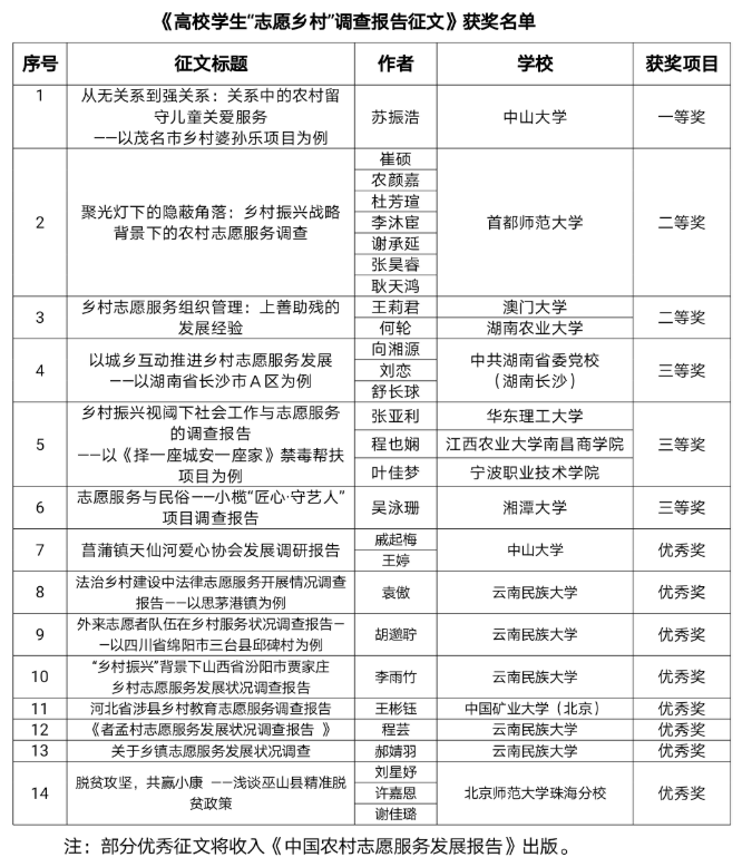 附件:《高校学生“志愿乡村”调查报告征文》获奖名单
