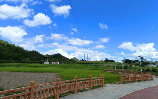 在休闲广场旁,还有一条由群众贡献自家土地“让”出来的绿道。绿道穿过稻田,经过荷花盛开的池塘,直达村口。这是村民一起投工投劳打造出来的,绿道中间是塑胶步道,两旁则是石板路和村民亲手种下的小花,视野开阔、满眼翠绿,偶有白鹭飞过,让人心旷神怡,流连忘返。这条绿道,意寓“道上绘古今,同走共富路”,通过绿道周边的宣传栏以及墙绘作品讲述着贾托村民从过去的贫穷落后、人心涣散逐步走向今天齐心、共富之路的故事,让这里的群众更加自豪、自信,更加积极地参与村寨的建设发展之中。
